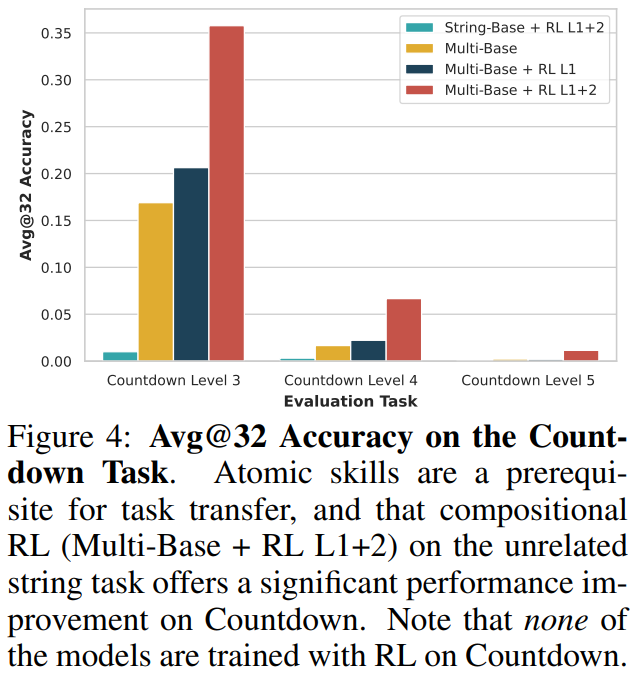 测试结果显示,尽管未在Countdown任务上进行强化学习,仅在复合函数输出预测上进行强化学习后的模型在多步Countdown任务上的表现也取得了明显提升。这表明强化学习获得的并非特定于字符串任务的技巧,而是一种能够组织和调度已有原子技能的通用能力,即一种元技能。然而,这一迁移也是有条件的,在其他任务上学到的组合能力并不能泛化到模型不具备原子能力的任务上,即SFT阶段如果未学习Countdown的原子能力,模型在强化学习后无法完成Countdown任务。