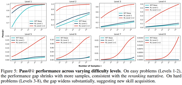 结合不同难度下的准确率、不同采样预算下的 pass@k 表现以及错误类型的细致分析,研究人员构建了一条完整而自洽的证据链,从多个角度支撑了其关于强化学习技能获取机制的结论。