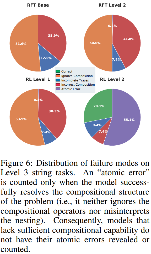 而经过组合任务强化学习训练的模型,其错误更多来自原子步骤的执行失误,而非对整体组合结构的误解。这说明强化学习首先教会模型正确理解和执行组合结构,即使失败,也失败在更低层级,从而体现出一种认知层面的变化。
