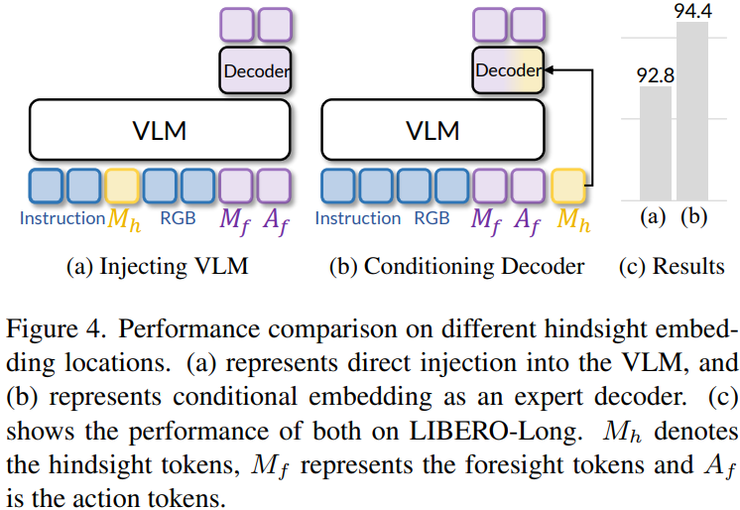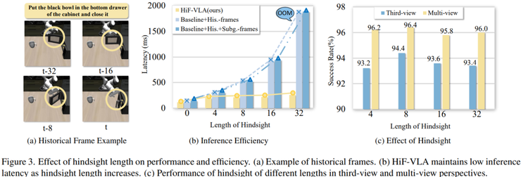 其次在历史信息的使用方式上,研究比较了两种策略,一种是将历史信息直接输入视觉语言模型,此时成功率为 92.8%,另一种是将历史信息注入到决策模块中,此时成功率提升到 94.4%。这一结果说明,将历史信息直接加入视觉语言模型会影响其原有的视觉与语言理解过程,而在决策阶段引入历史信息能够更有效地发挥其作用。