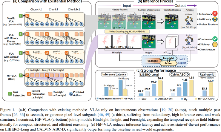 在这样的背景下,西湖大学王东林团队提出了论文 《HiF-VLA:Hindsight, Insight and Foresight for Vision-Language-Action Models》。研究中,HiF-VLA 不再简单依赖历史图像或未来画面预测,而是以“运动”作为时间信息的核心表达,使模型能够同时建模过去的变化、当前状态以及未来趋势,从而实现更稳定的连续决策。