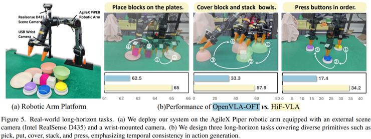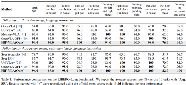 在长序列任务 LIBERO-Long 上,这项研究主要测试机器人是否能够连续完成多个动作,例如拿取物体、放置以及关闭装置等。研究结果表明,HiF-VLA 在单视角条件下的成功率达到 94.4%,在多视角条件下达到 96.4%。