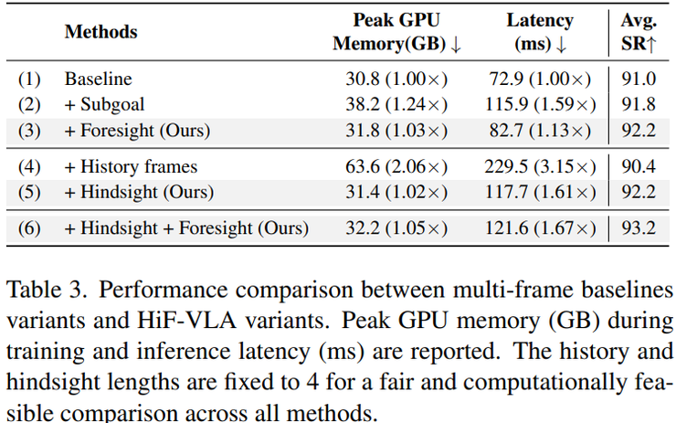 在效率与计算成本方面,研究进一步分析了性能提升是否以计算开销为代价。结果显示,当引入基于图像的未来子目标预测时,成功率为 91.8%,但延迟增加到 115.9 毫秒,比基线慢 1.59 倍。当采用历史帧堆叠时,成功率反而下降到 90.4%,延迟上升到 229.5 毫秒,是基线的 3.15 倍,说明大量图像信息不仅带来高计算成本,还会干扰模型判断。