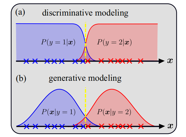 图示:标签 y ∈{1,2} 的二元分类问题的 (a) 判别方法和 (b) 生成方法中建模的概率分布示意图。(来源:论文)