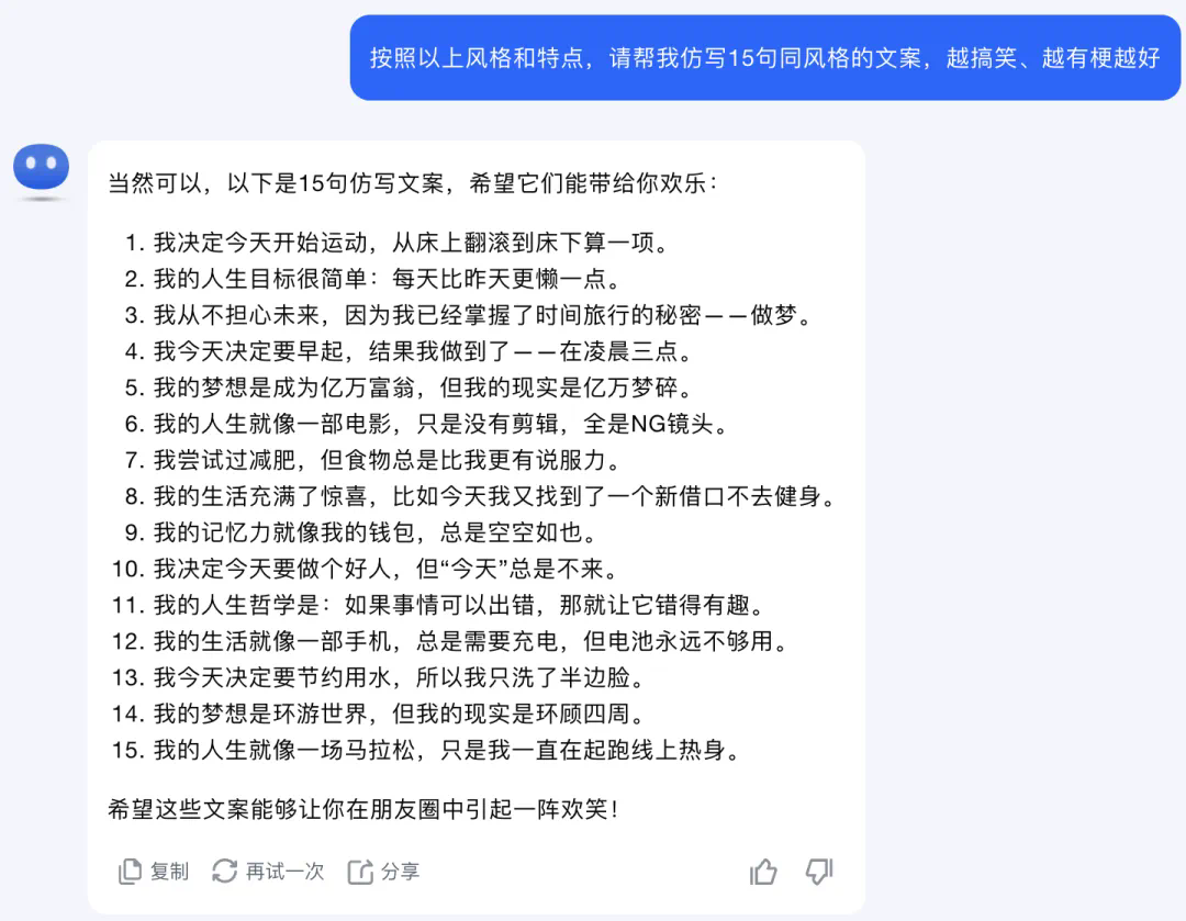 我们用同样的套路让 Kimi 生成 10 个搞笑文案。