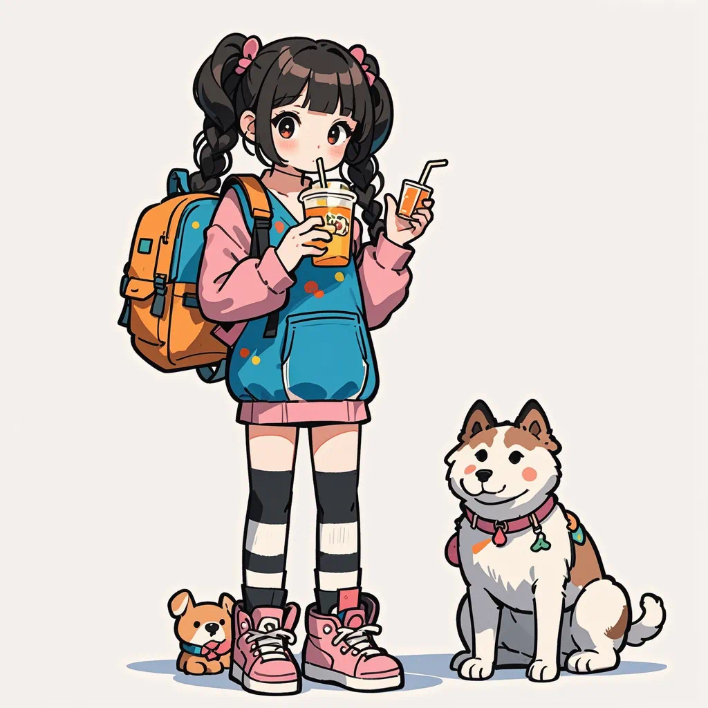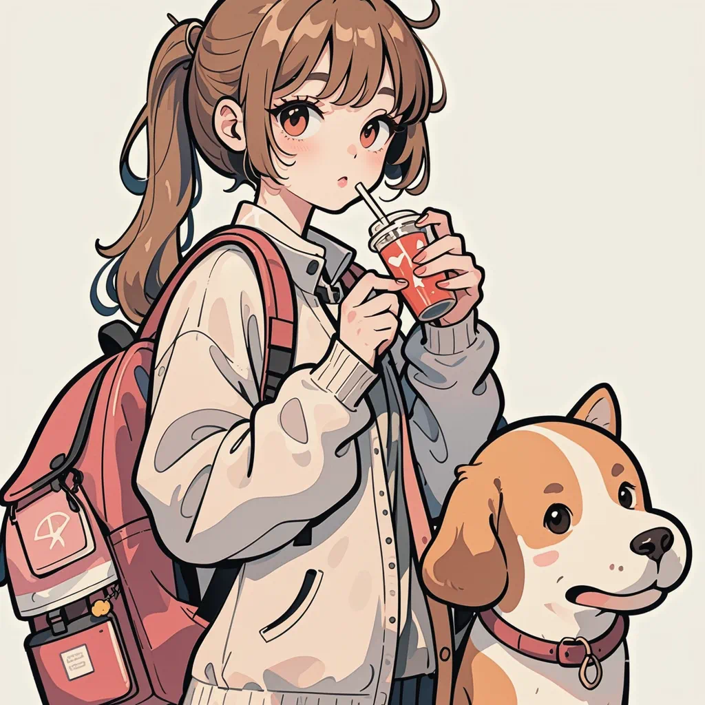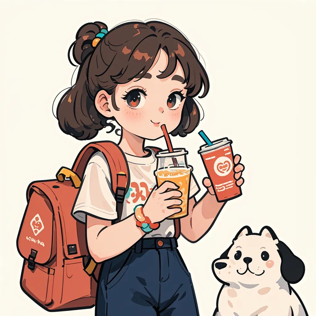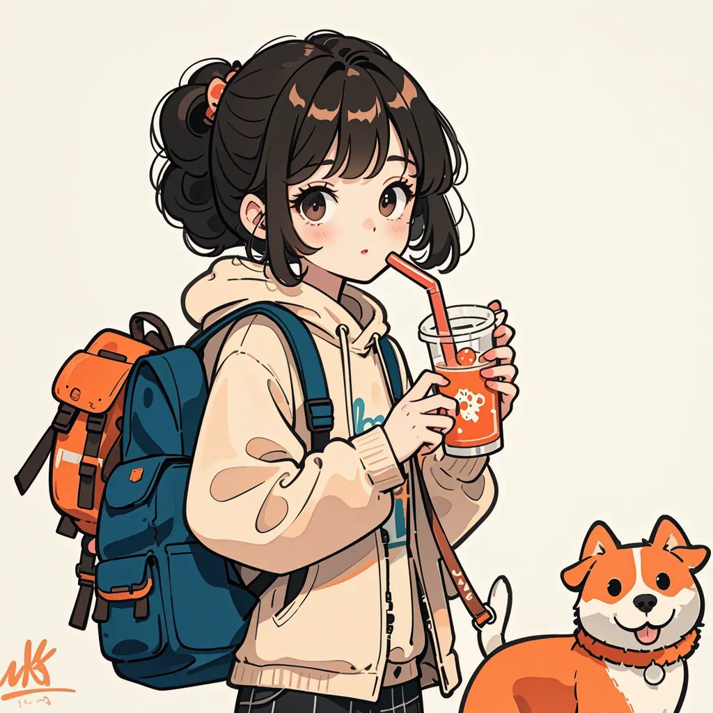 「卡通女孩背着双肩背包正在喝饮料,旁边跟着一只狗,可爱美术风格,插画风格,可爱卡通风格,素描风格,动漫风格插画,可爱的艺术作品」