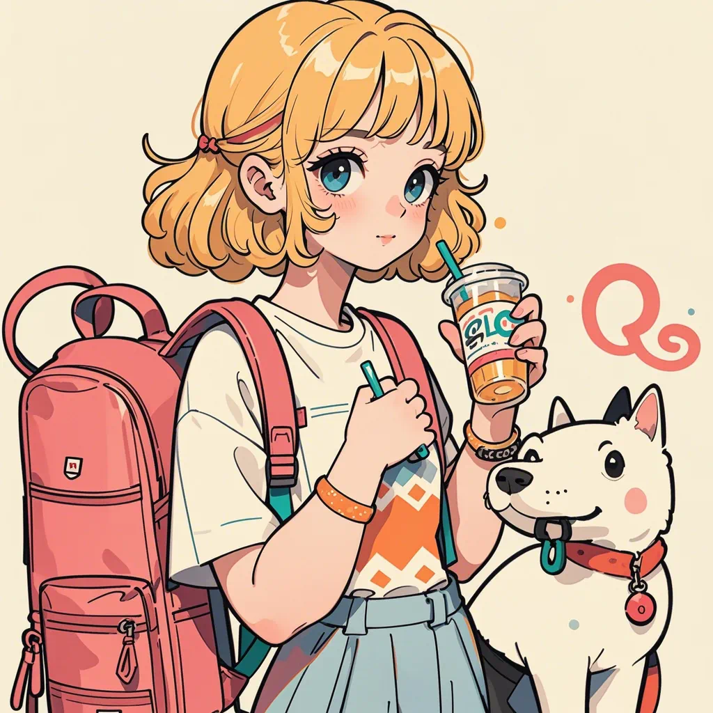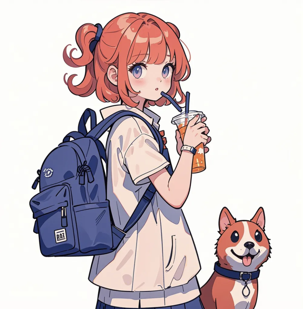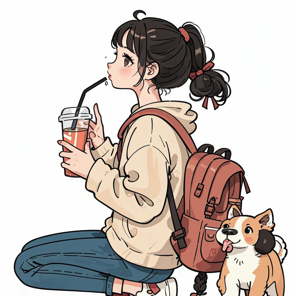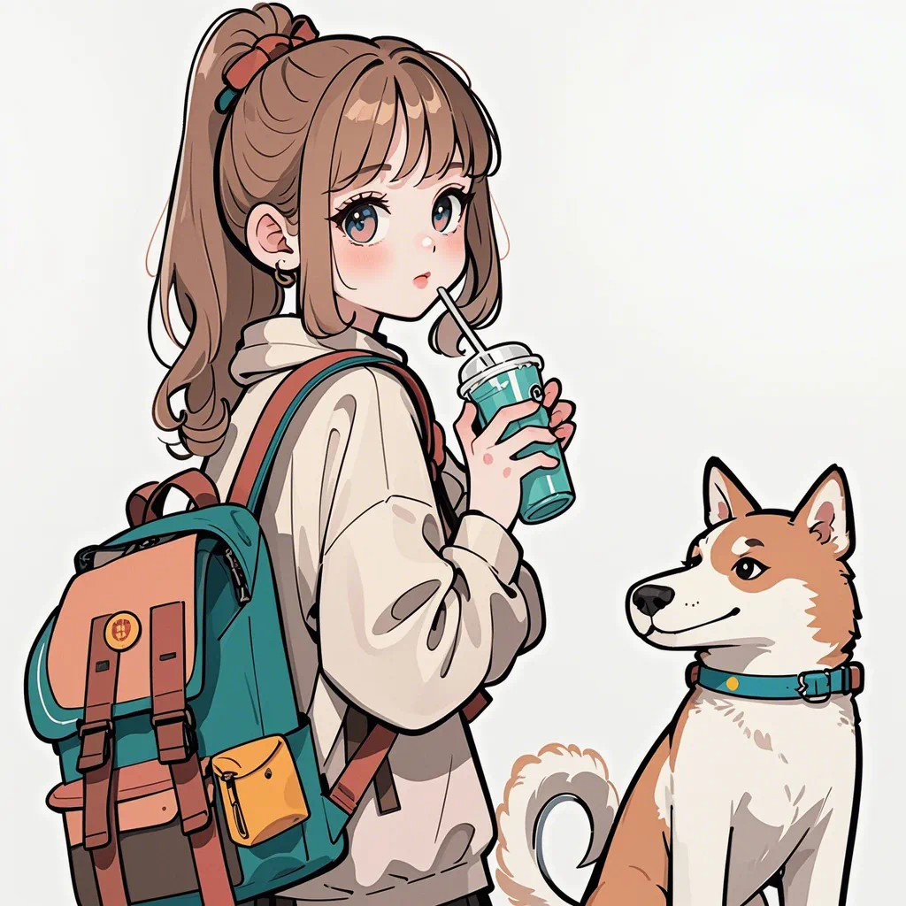 「卡通女孩背着双肩背包正在喝饮料,旁边跟着一只狗,可爱美术风格,插画风格,可爱卡通风格,素描风格,动漫风格插画,可爱的艺术作品」