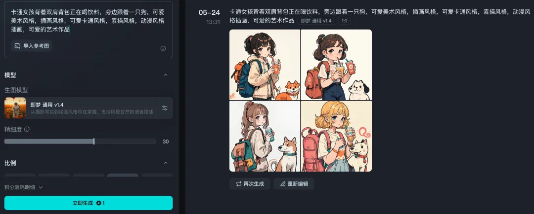 生成模型选择最新的「即梦通用 V1.4」,精细度默认为 30,比例选择 1:1。