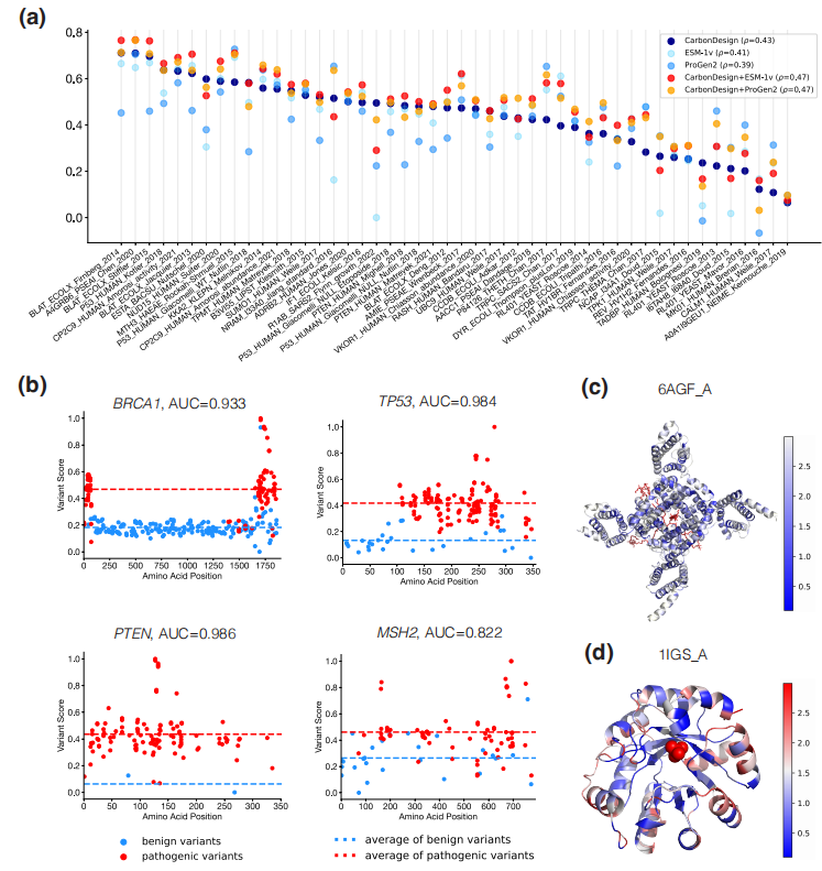 此外,CarbonDesign 支持以零样本学习的方式来预测序列变异的功能效应,证明了其捕获蛋白质序列及其功能之间内在关系的能力。这表明 CarbonDesgin 也可以作为蛋白质功能突变影响的零样本预测器。