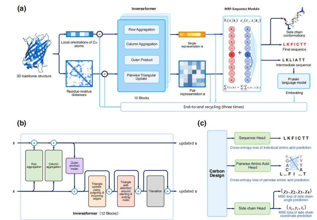 1. CarbonDesign 采用网络循环策略(network recycling),以端到端的方式引入蛋白质序列语言模型。在数以亿计的蛋白质序列上预训练的蛋白质语言模型,为 CarbonDesign 提供了有效的进化约束和设计序列的先验信息。