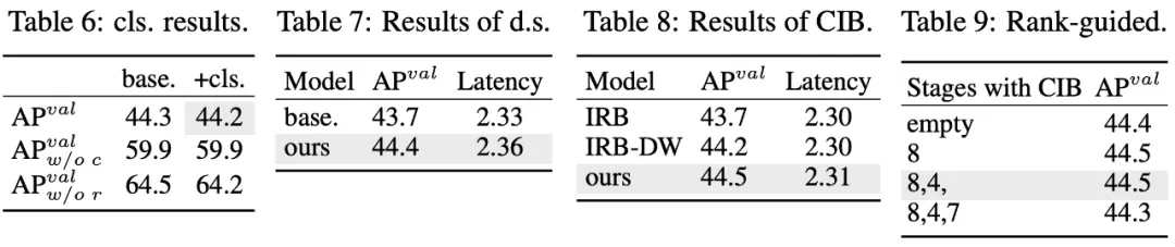 如下表所示,每个设计组件,包括轻量级分类 head、空间通道解耦下采样和排序指导的模块设计,都有助于减少参数数量、FLOPs 和延迟。重要的是,这些改进是在保持卓越性能的同时所实现的。