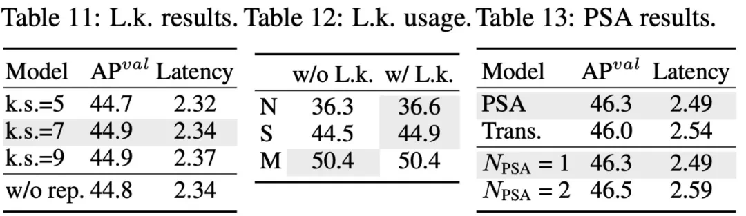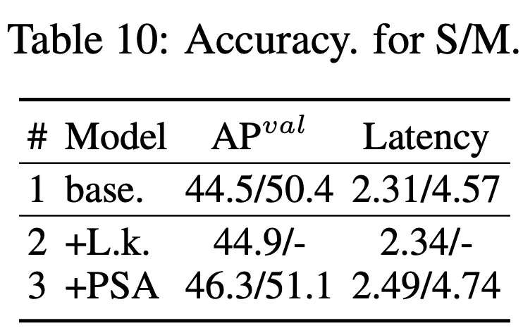 如表 10 所示,采用大核卷积和 PSA 模块分别在延迟最小增加 0.03ms 和 0.15ms 的情况下,使 YOLOv10-S 的性能有了 0.4% AP 和 1.4% AP 的显著提升。