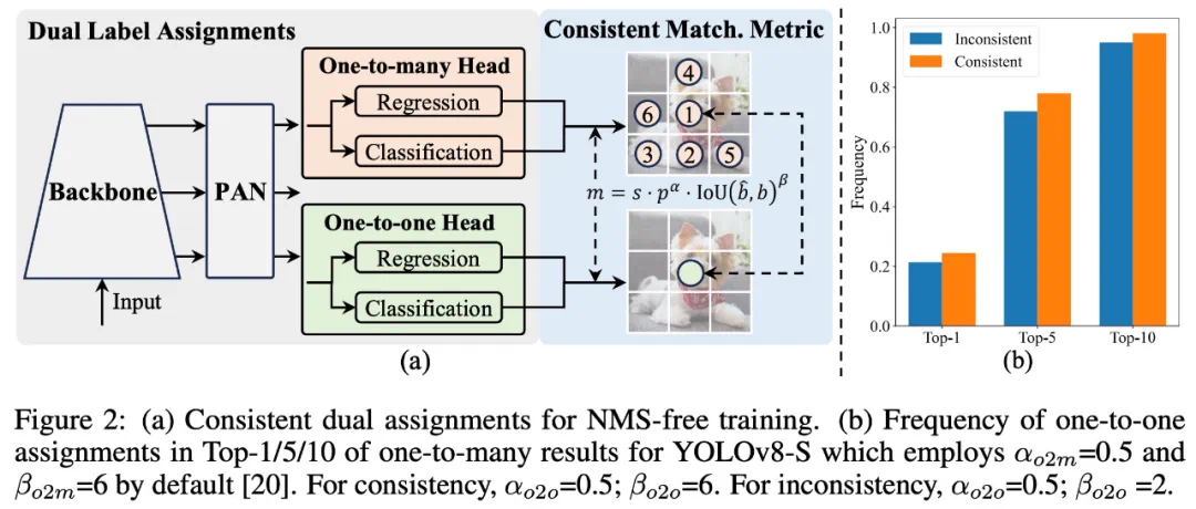 与一对多分配不同,一对一匹配对每个 ground truth 仅分配一个预测,避免 NMS 后处理。然而,这会导致弱监督,以至于准确率和收敛速度不理想。幸运的是,这种缺陷可以通过一对多分配来弥补。