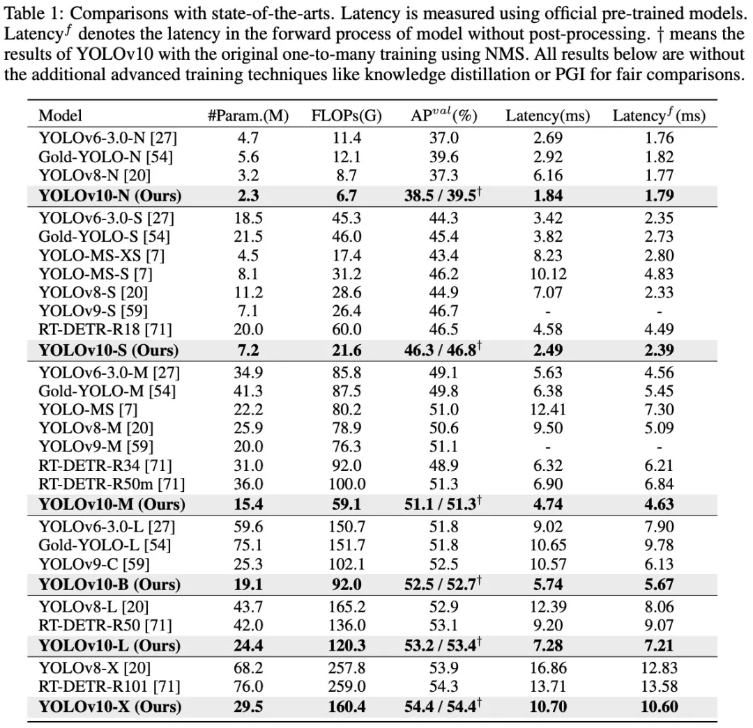 如表 1 所示,清华团队所开发的的 YOLOv10 在各种模型规模上实现了 SOTA 的性能和端到端延迟。