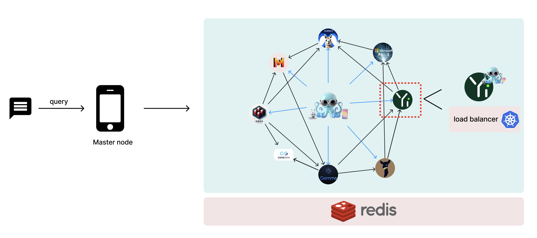本节详细说明了复杂图中每个节点代表一个语言模型的系统架构,利用多个Octopus模型进行协调。在我们准备生产部署时,整合一个负载均衡器以有效管理系统需求至关重要。下面,我们将系统划分为几个可管理的组件,强调核心方法: