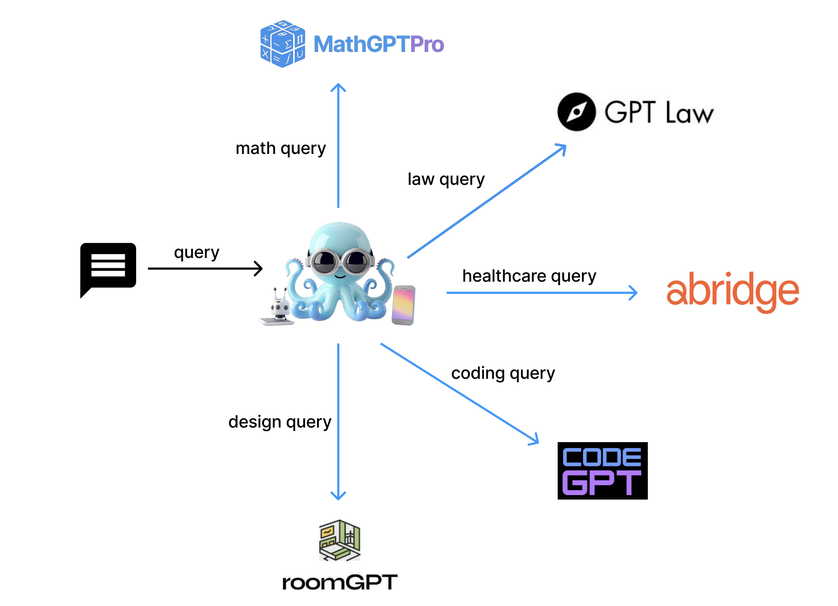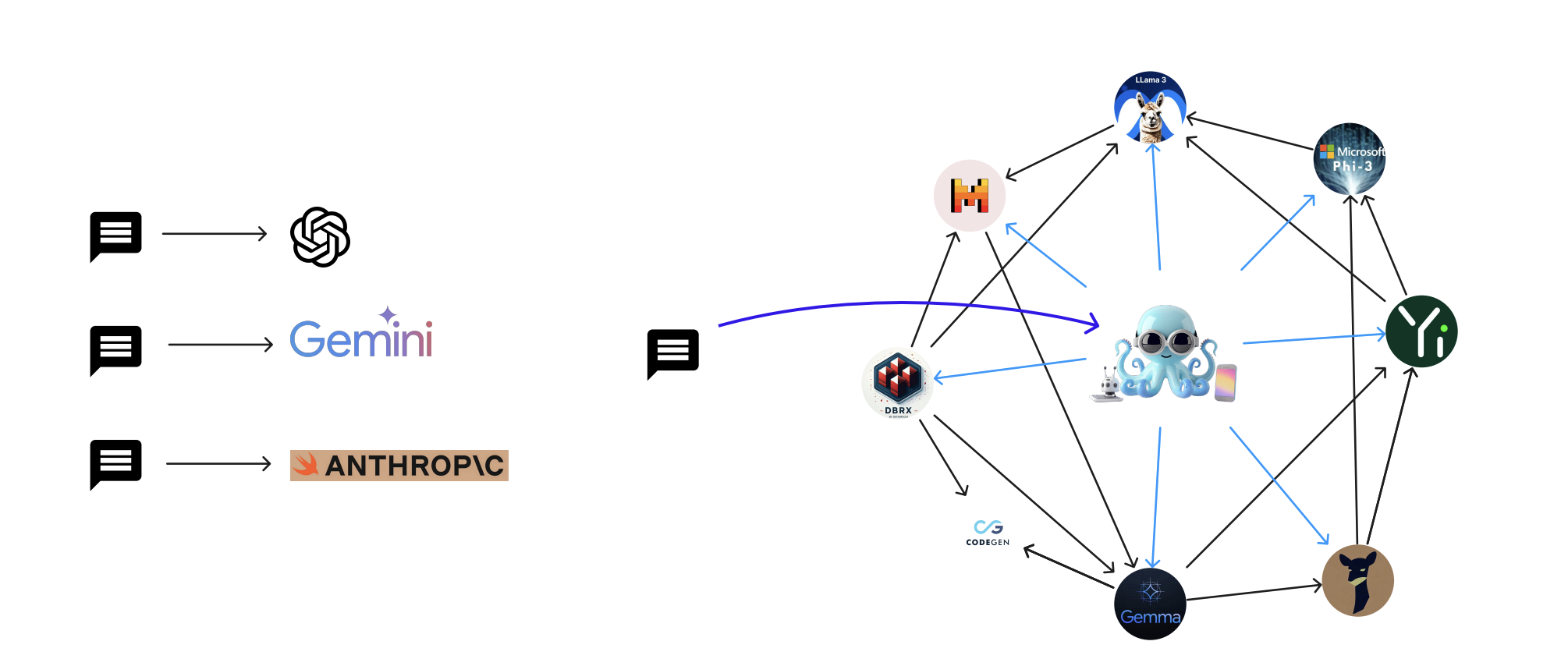 在本文中,我们介绍了一种使用语言模型的新框架,通过构建一个以不同垂直语言模型为节点的图。我们使用Octopus v2模型的特性,并将其用作协调器。从单一模型推理到多节点推理的转变在图(1)中展示。