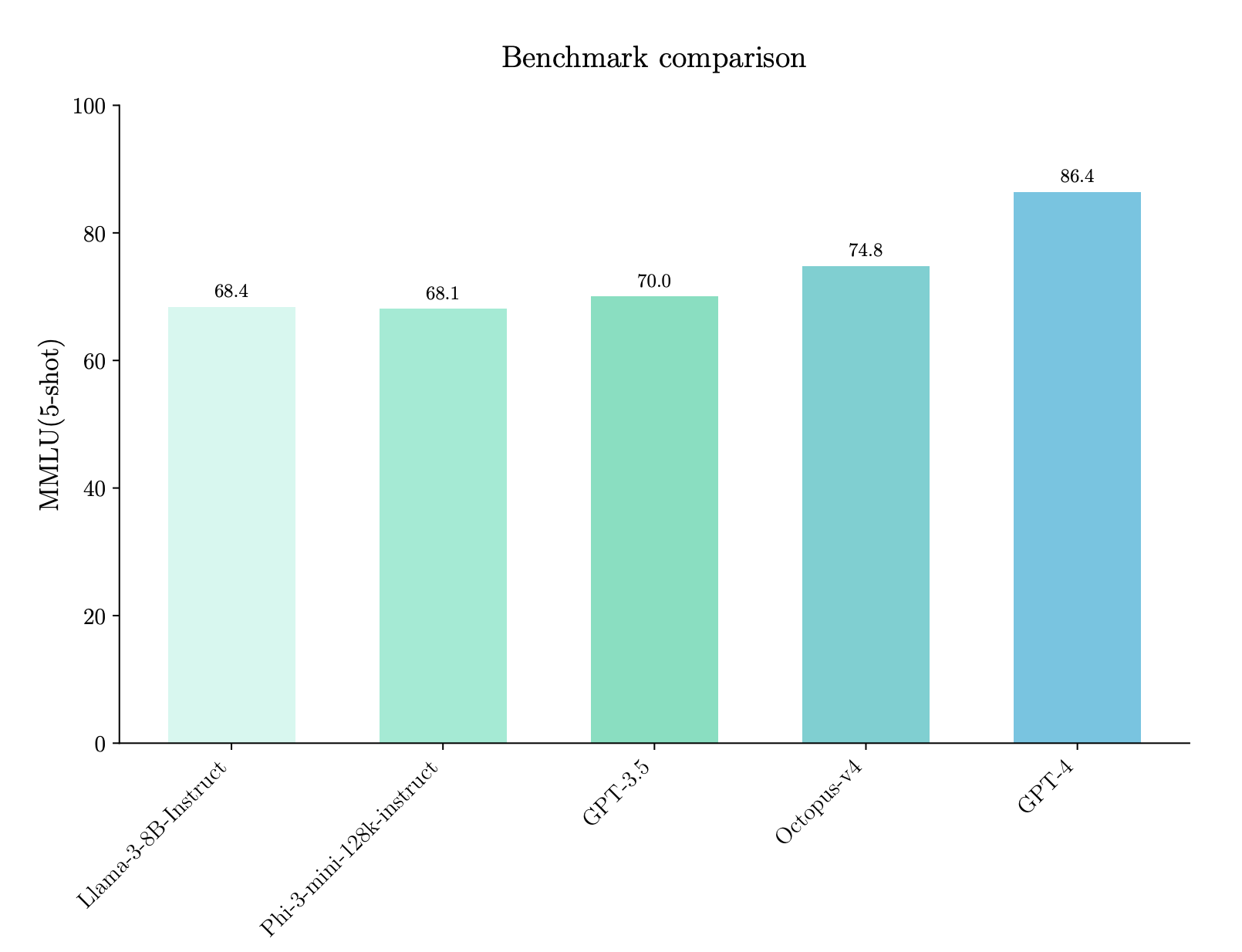 本节介绍了对Octopus v4系统的基准评估,比较了其性能与其他著名模型使用MMLU基准的表现,以展示我们模型的有效性。在我们的推理系统中,我们使用两个紧凑的语言模型:3B参数的Octopus v4模型和一个不超过8B参数的另一个工作语言模型。比较展示在图(5)中。推理过程在图(2)中演示。