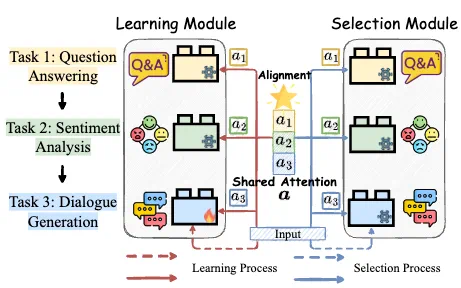 一方面,学习模块的设计旨在促进不同任务之间的知识迁移。不幸的是,学习模块分配的 PET 只学习当前任务特定知识的现状阻断了存储在已习得的 PET 块中的来自先前任务知识的潜在迁移,并阻碍它们协助当前新任务知识的获取。