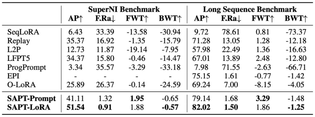 我们基于 Prompt Tuning 和 LoRA 这两个具有代表性的参数高效微调方法,在 SuperNI Benchmark,Long Sequence Benchmark 两个评测基准上进行了实验,评价指标为:平均性能(AP)、遗忘率(F.Ra)、前向迁移 (FWT) 以及反向迁移 (BWT)。如表 1 中结果所示,SAPT 具有最高的 AP 和最低的 F.Ra,表明其能够有效应对灾难性遗忘。与此同时,其在 FWT 和 BWT 上也具有最优的表现,体现出 SAPT 能够实现有效的知识迁移。