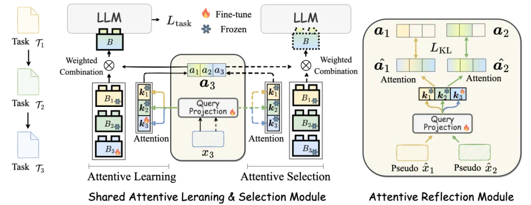 本文提出了针对大语言模型的共享注意力持续学习框架 SAPT,为同时应对灾难性遗忘和知识迁移的挑战提供了有效的解决方案。SAPT 的整体架构由两个关键组件组成,如图 2 所示:共享注意力学习与选择模块(SALS)和注意力反思模块(ARM)。在 SALS 中,注意力学习(实线)和注意力选择(虚线)通过共享注意力操作对齐。然后在 ARM 中,我们通过生成的伪样本帮助 SALS 回忆来自以前任务输入对应的正确的注意力权重。