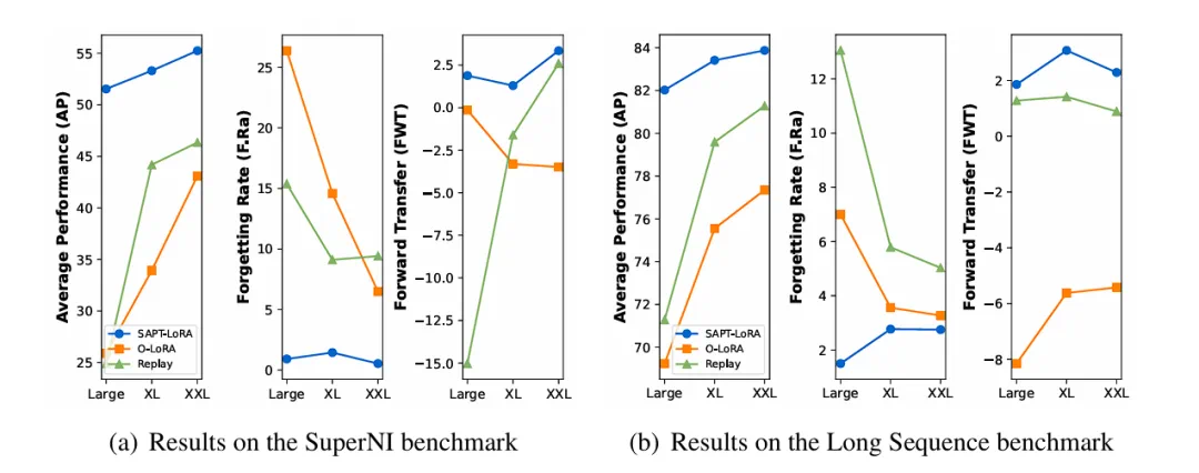 我们将实验采用的基础大模型拓展到了不同的规模,我们实验分析了 T5 模型大小如何影响 SAPT 的性能。图 4 显示了随着逐渐增大的基础模型大小,即 Large(770M)、XL(3B)和 XXL(11B),SAPT、O-LoRA 和 Replay 在 AP、F.Ra 和 FWT 方面的表现。总体而言,随着基础模型大小的增加,在抵抗灾难性遗忘和促进知识迁移方面,SAPT 始终能够展现出比基线方法更优越的性能。