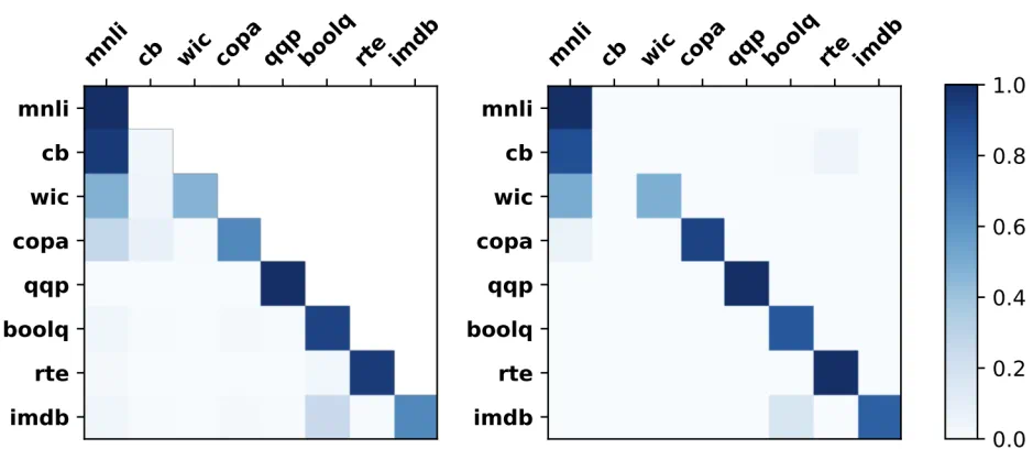 图 3 展示了在训练(左图)和测试(右图)期间共享注意力的分布示意图。我们可以观察到:(1)PET 块的学习和选择过程是完全对齐的,两个热力图几乎具有相同的布局。(2)知识迁移确实发生在注意力学习过程中,以帮助 SAPT 获取新知识。这些进一步验证了 SAPT 处理灾难性遗忘和知识迁移的有效性。
